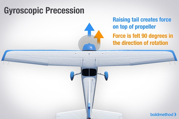 - An inherent quality of rotating bodies, which causes an applied force to be manifested 90º in the direction of rotation from the point where the force is applied.